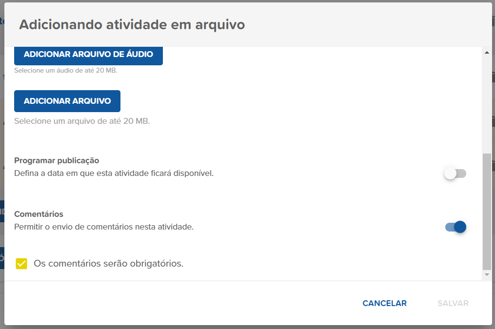 - Caso queira disponibilizar a interação de comentários naquela atividade, clique no botão localizado no lado direito (quando o botão estiver azul, significa que os comentários estão ativos);