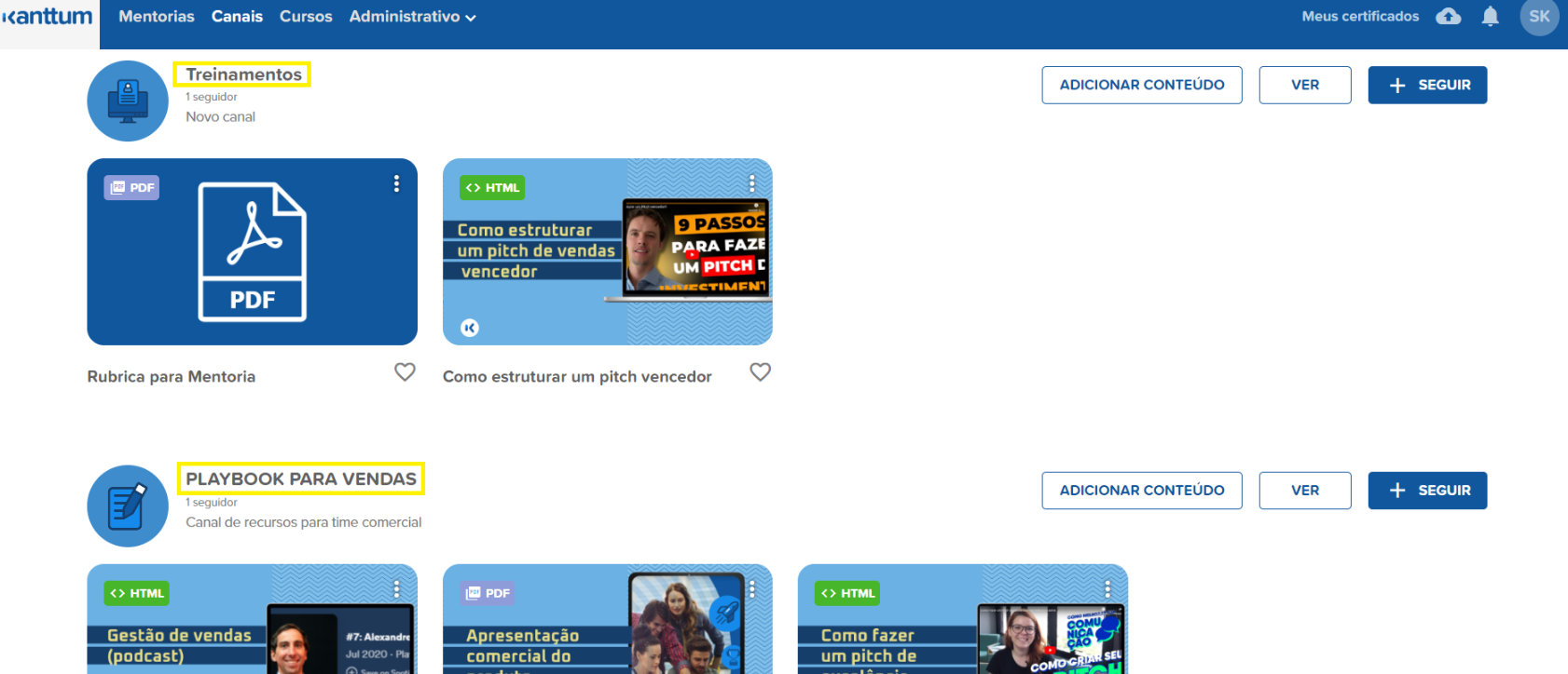 Na plataforma, você terá a funcionalidade de Canais, onde será possível inserir conteúdos em formatos diferentes. Recomendamos que os canais sejam criados de acordo com o seu objetivo, separando por temas ou por áreas da sua instituição. Além disso o ideal é que você estruture conteúdos mais curtos, como trilhas de aprendizado, pílulas de conhecimento, e deixe a parte "completa" que irá precisar de um tempo a mais do cursista em Cursos. Clique aqui para saber como estruturar um curso.