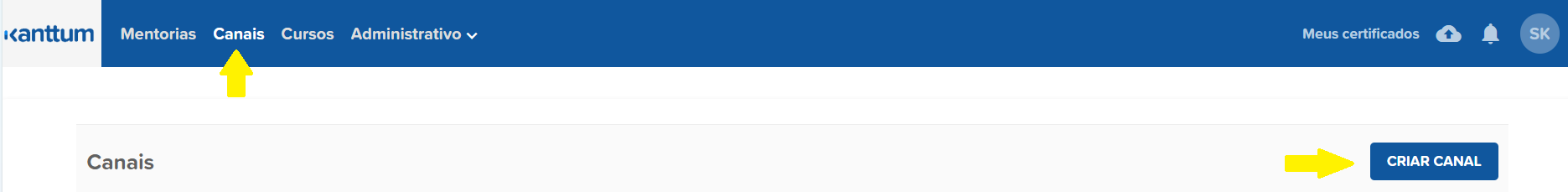 Para iniciar seu canal, clique na aba "Canais", se esta aba não estiver habilitada, você pode habilitar nas configurações, clique aqui para acessar o artigo e aprender como habilitar.