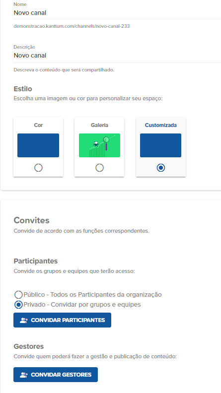 - Convites: você pode realizar convites tanto para cursistas quanto gestores do canal. Os primeiros serão participantes, enquanto os segundos poderão fazer a gestão e publicação de conteúdos. Os convites você pode fazer posteriormente, recomendamos que deixe o canal privado, dessa forma ninguém terá acesso até que você realize os convites. Clique aqui para saber mais sobre convites.