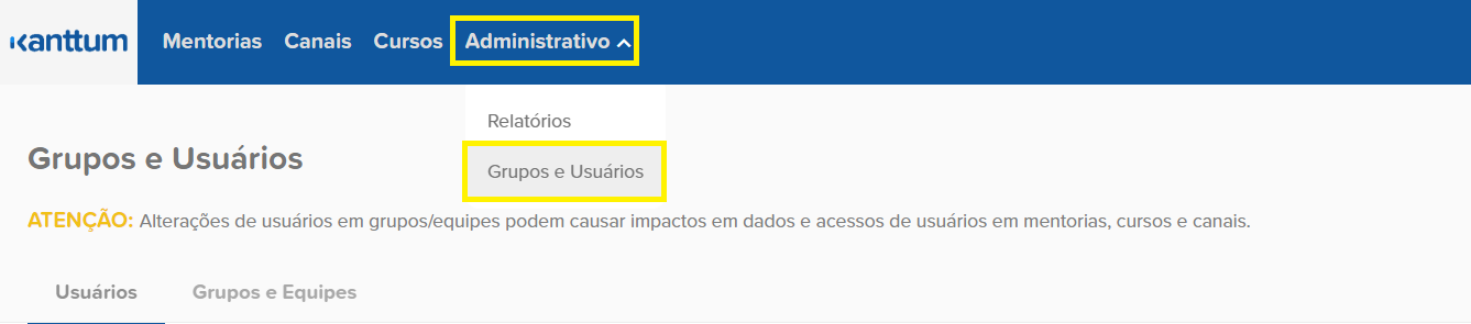 Na tela inicial, clique em "Administrativo" e em seguida "Grupos e Usuários":