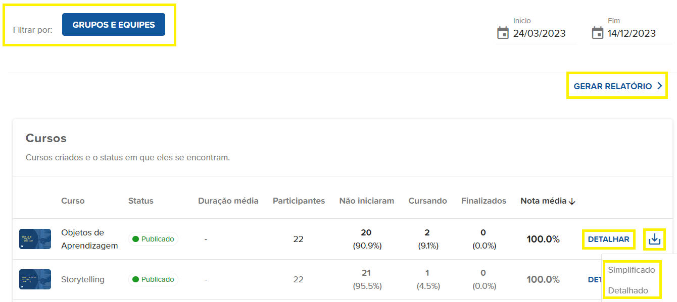 - Relatório Simplificado → Permite gerar um relatório exportável composto por dados de progresso e andamento dos participantes de um curso.