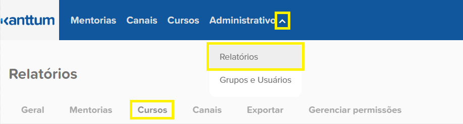 Os Relatórios de Cursos, estão disponíveis na terceira aba de Relatórios.