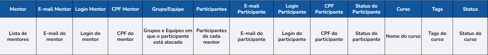 Será exportado um relatório geral, com as informações abaixo, refere a todos os cursos que estão no seu ambiente: