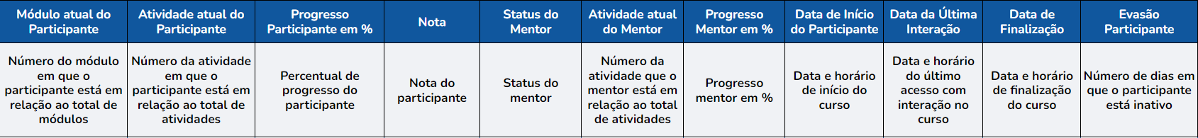 Os dados desse relatório você pode, por exemplo, entender como foi o engajamento de cada participante de acordo com um curso específico.