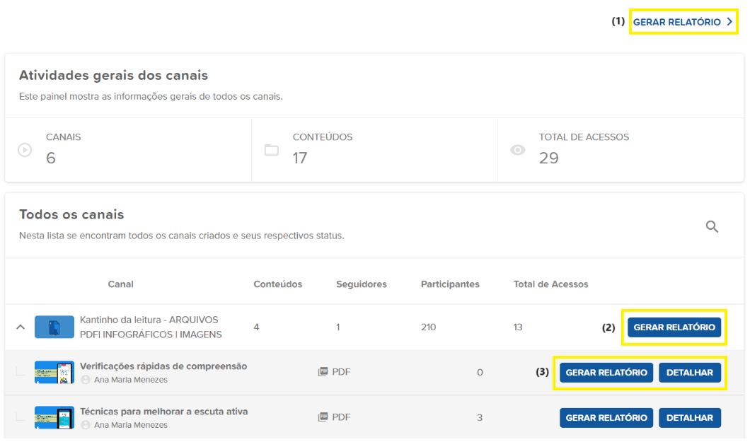 Na aba de Canais você terá acesso ao "Gerar Relatório" geral, "Atividades gerais dos canais", ao "Gerar Relatório" de um canal ou de um conteúdo específico e ver "Detalhes" sobre um conteúdo.