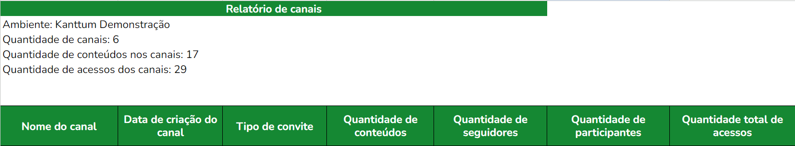 Será exportado um relatório geral, com as informações abaixo, referente ao canal que você escolheu: