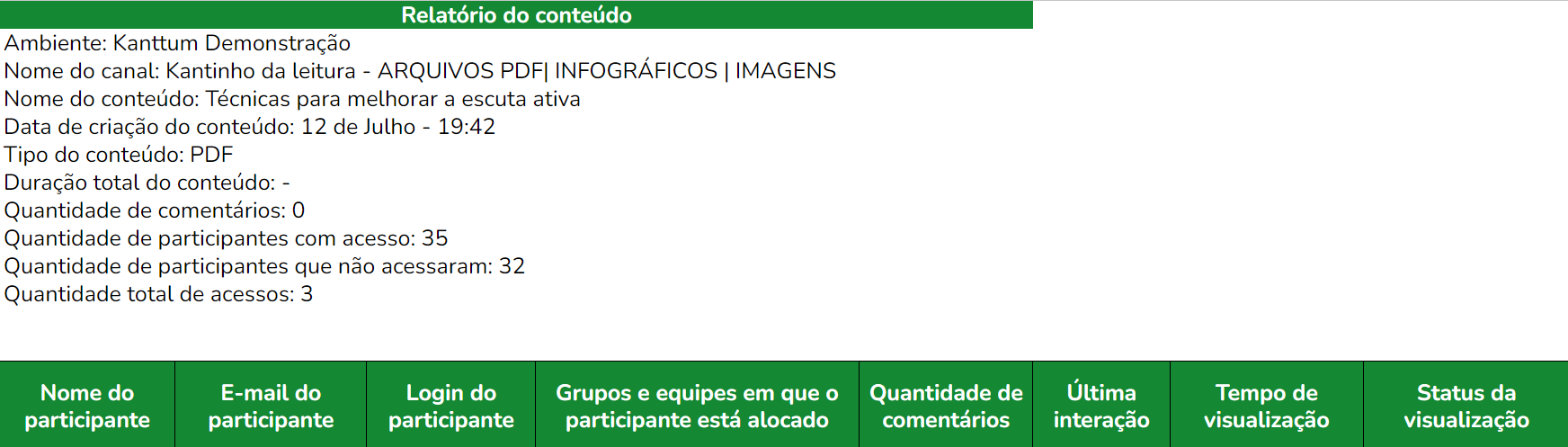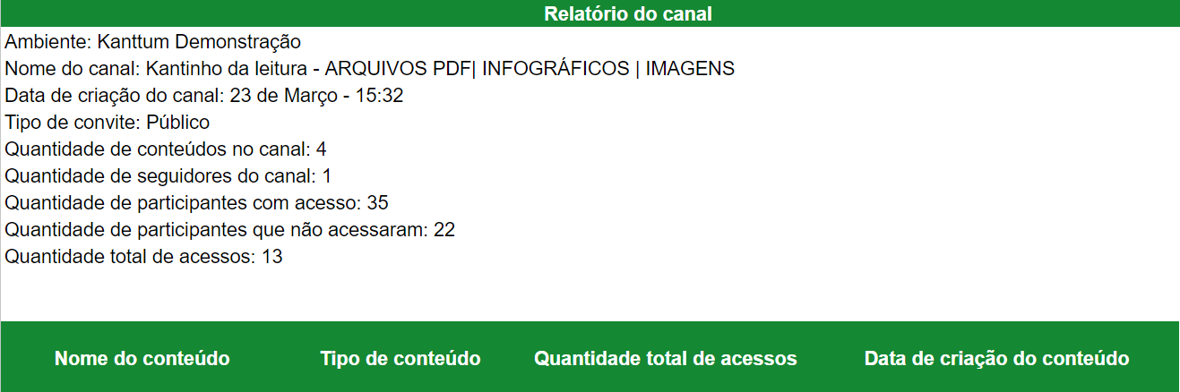 Com os dados desse relatório você pode, por exemplo, entender de forma geral os acessos e a quantidade de conteúdos que um canal específico possui, além de sabe quantos participantes estavam convidados.