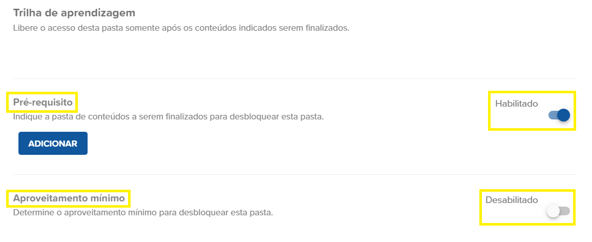 - Aproveitamento mínimo --> você pode escolher se para liberar essa pasta o participante terá que que atingir um aproveitamento mínimo, se estiver desabilitado será liberado independente do aproveitamento.