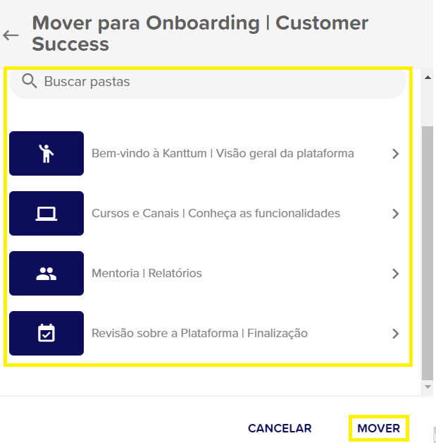 Mover: é possível mover um curso para uma pasta e/ou alterar de pasta. Após clicar em "Mover", será aberta uma nova tela, que exibirá as opções de pastas, selecione a pasta desejada e clique em "Mover":