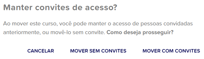 Feito isso uma nova tela será aberta, com as opções de cancelar, mover sem convites ou mover com convites, escolha se deseja mover com os convites que já existem no curso ou se for um curso que será destinado para outros usuários e você fará o convite posteriormente, selecione para mover sem convites.