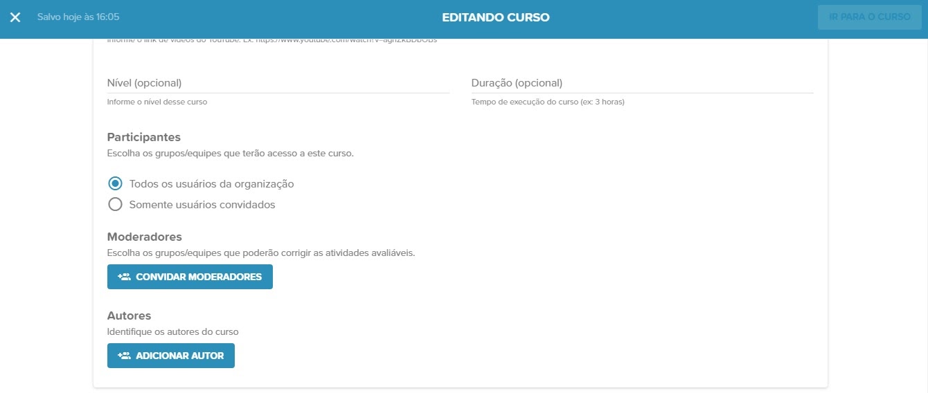 Agora, se desejar deixar o curso aberto para todos os integrantes, basta selecionar a opção: Todos os usuários da organização.